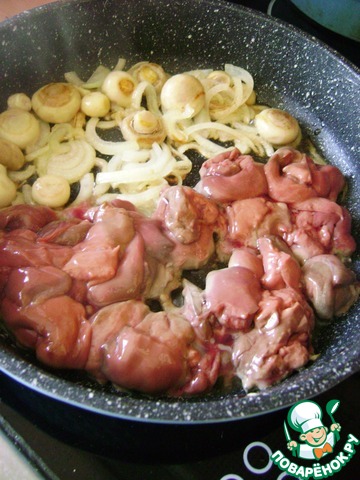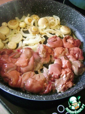 Лук нашинковать, грибы лучше взять мелкими и оставить целиком. Обжарить лук с грибами, сдвинуть в сторону и добавить в сковороду печенку.