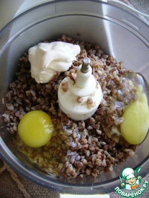 Гречневую кашу пробить в блендере с яйцами и сметаной.