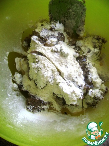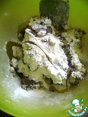 Добавить муку с разрыхлителем, растительное масло и быстро замесить тесто.