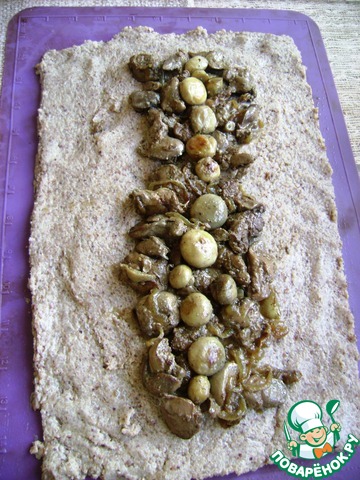 Посередине дорожкой выложить печенку, сверху разложить грибы с луком. -