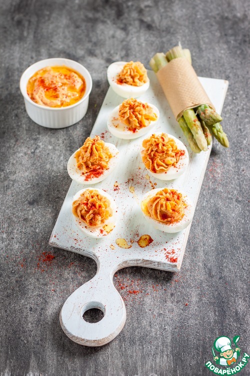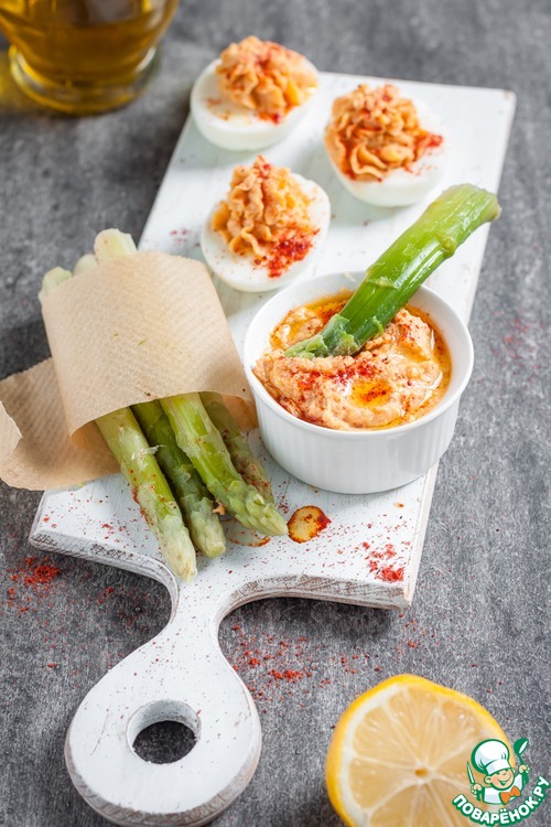 Половинки яиц нафаршировать полученной массой, немного сбрызнуть оливковым маслом, посыпать паприкой или острым перцем. Отдельно подать спаржу и хумус.