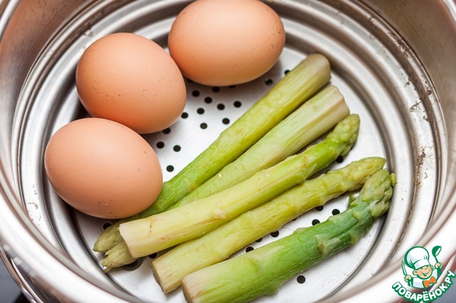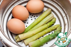 • На кастрюлю ставим пароварку, кладем туда яйца, которые надо предварительно вымыть с мылом. Я еще заодно решила приготовить спаржу, которая впоследствии была подана с готовым хумусом в качестве еще одной закуски. Спаржу сбрызнуть немного лимонным соком.