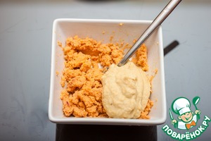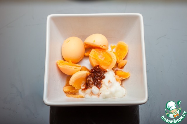 • Яйца разрезать пополам, разделить на белки и желтки, к желткам добавить йогурт и аджику, размять вилкой.