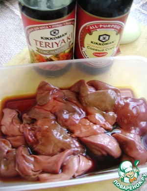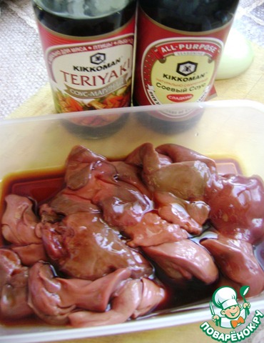 Куриную печень промыть и обсушить. Залить соевым соусом, взяв по столовой ложке сладкого соуса ТМ «Киккоман» и соуса терияки это же марки. Дать промариноваться на столе в течении часа.