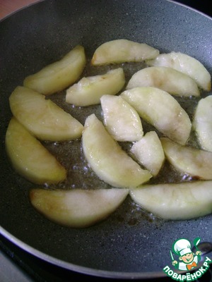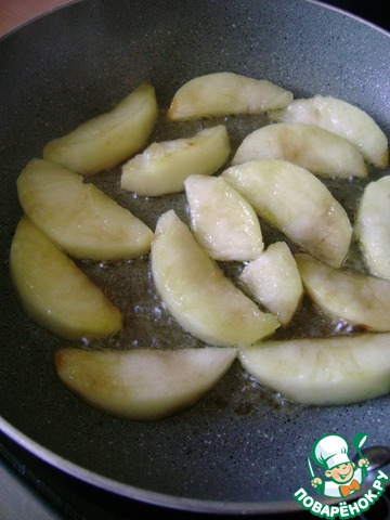 Разогреть ложку масла, всыпать половину столовой ложки сахара и выложить яблочные дольки. На среднем огне слегка подрумянить яблоки до мягкости. Перевернуть и сбрызнуть ложкой винного уксуса. Кислое яблоко будет намного вкуснее, но работать с ним сложнее, переворачивать нужно очень осторожно, поэтому выбор за вами. Переложить яблоки сразу на сервировочные тарелки.