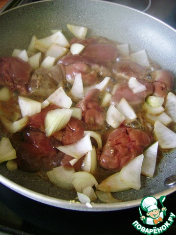 В сковороду долить масло и выложить печенку вместе с маринадом. Добавить нарезанный уголкам лук и жарить на среднем огне 2 - 3 минутки.