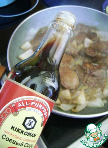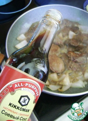 Перевернуть печень и полить сверху двумя ложками сладкого соевого соуса ТМ «Киккоман». Жарить еще минуты 4 -5, печень внутри должна оставаться розоватой.