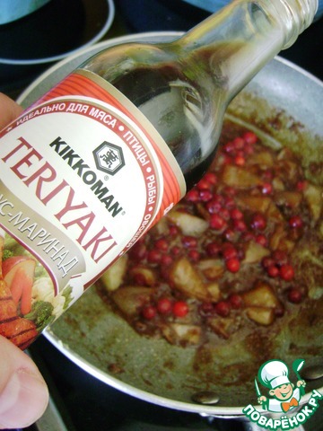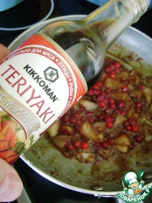 Печень убрать со сковороды, выложить к луку бруснику, добавить сахар и оставшийся винный уксус. Влить ложку соуса терияки ТМ «Киккоман». Помешивая, тушить пару минут до загустения соуса.