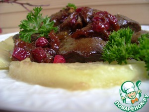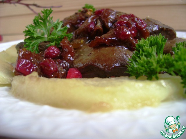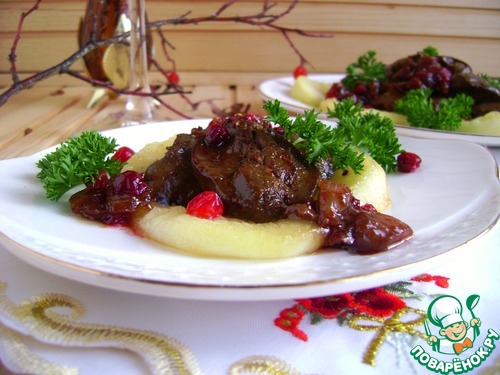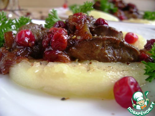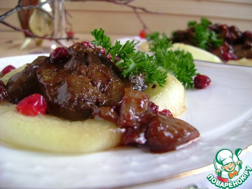 Выложить печень к яблокам, полить соусом с луком и брусникой, присыпать чуть перцем чили и подавать к бокалу белого вина. Хорошо подать к печени свежие белые тосты.