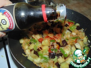 Добавить баклажан, нарезанный крупными кубиками (я не чищу баклажаны). И готовить ещё пару минут.