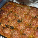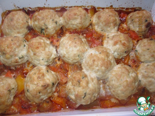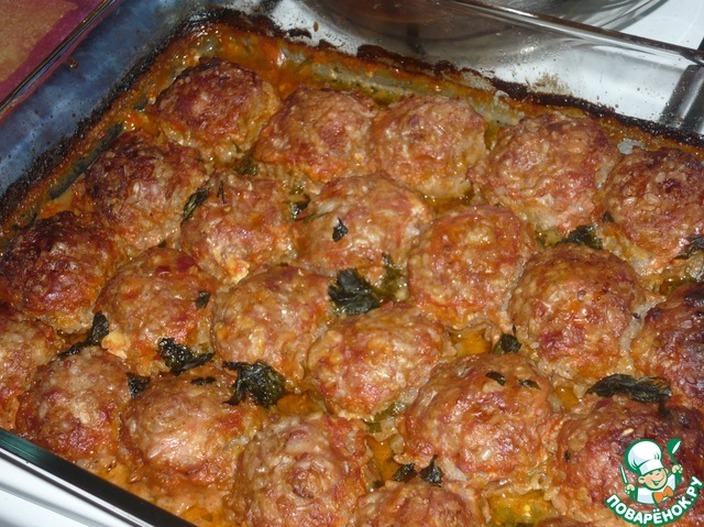 Сверху выложить фрикадельки. Запекать в духовке, примерно 40 минут, при среднем огне. Можно подавать с рисовой или гречневой лапшой или любым гарниром.