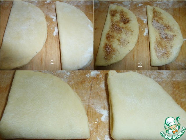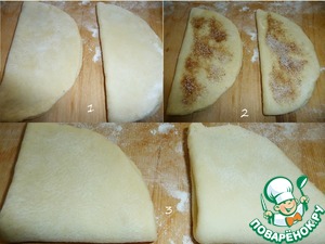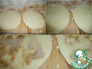 Взять две заготовки. Раскатать их в круглые лепёшки, диаметром 15 см, припыляя рабочую поверхность мукой. Смазать их поверхности слегка растительным маслом и присыпать начинкой.