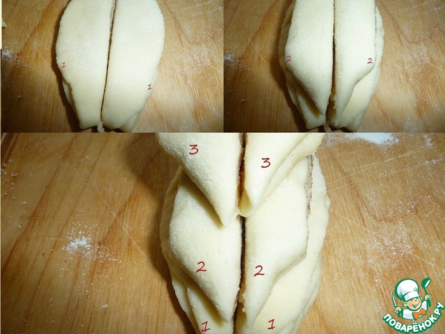 Взять два самых длинных отрезка и соединить их вместе по срезу (получится заготовка из теста с округлыми торцами). Затем взять средние по длине отрезки, соединить их вместе и положить поверх предыдущей заготовки. Взять оставшиеся кусочки (они треугольной формы), соединить их вместе и выложить их третьим ярусом поверх первых предыдущих слоёв. Получилась конструкция из теста в три слоя. Чтобы конструкция держалась, следует смазать слои между собой белком.