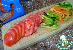 Вымыть и нарезать перец и помидор. Включить духовку.