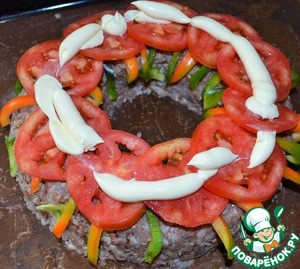 На силиконовом коврике сформировать кольцо - венок из фарша, 20 - 22 см.. Выложить на него полоски перца.