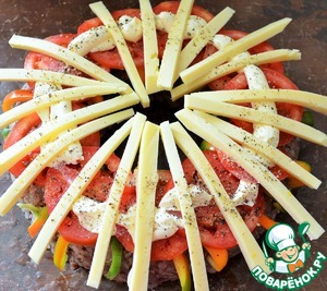 Сыр нарезать длинными полосками и выложить поверх овощей.