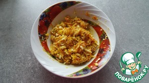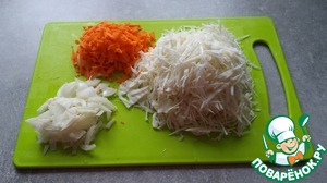 Пока тесто отдыхает, готовим начинку: шинкуем капусту, лук и морковь.