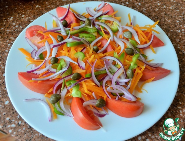 Перец вымыть, нарезать мелкими полосками. Выложить. Лук нарезать перьями, выложить на салат. ( Если Вы будете использовать более острые сорта лука, необходимо предварительно замариновать его для удаления специфического вкуса). Добавить каперсы, ягоды барбариса.