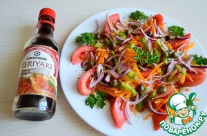 Оливковое масло смешать с соусом маринадом. Терияки от ТМ Киккоман отлично приправит этот салат, придаст пикантный вкус.