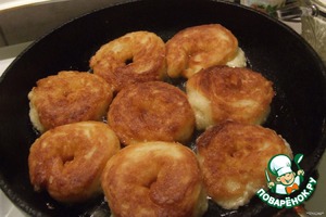 А теперь будем жарить пончики. Выкладываем их на сковороду и жарим пончики с двух сторон до золотистого цвета.