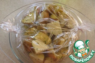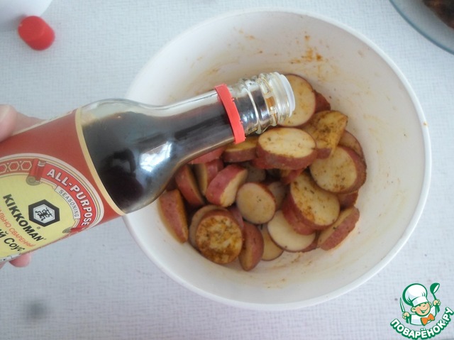 • Картофель тщательно помыть, нарезать на кружочки толщиной не более 1 см. Добавить все пряности, соль, соевый соус. Перемешать и убрать мариноваться на 1 час.