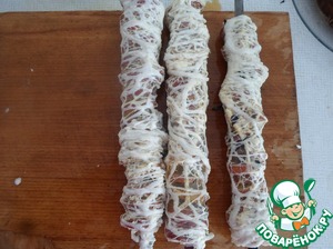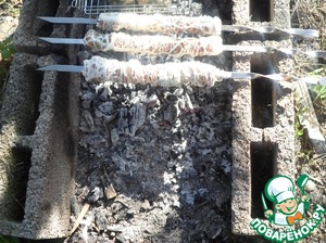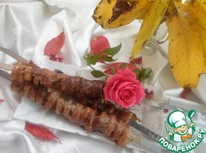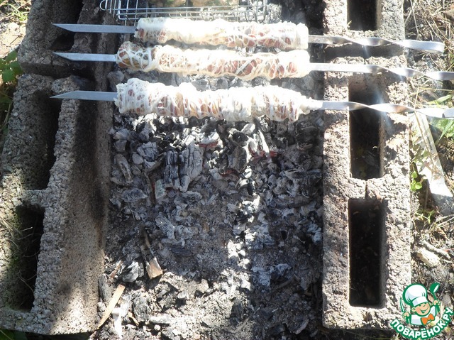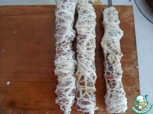 • Затем раскладываем на доске жировую сетку, нанизываем картофель на шампур и заворачиваем все это дело. Обернуть картофель сеткой нужно в 2 или 3 слоя.
