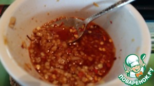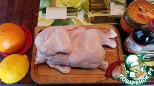 Готовим маринад. Чеснок измельчить и смешать с тертым имбирем и цедрой, лимонным и апельсиновым соком, медом и соусом-маринадом "Терияки" от ТМ "Киккоман". Обмазываем курицу маринадом и оставляем пропитываться на пару часов.
