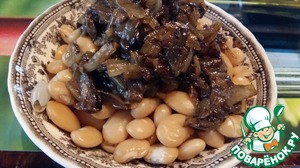 В это время варим фасоль и жарим с репчатым луком грибы. Все перемешиваем. Эту начинку можно употреблять и отдельно в виде теплого салата. Это очень вкусно!
