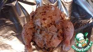 Аккуратно с напуском завернуть курицу в фольгу. Иначе при соприкосновении куриная кожа, по закону подлости, обязательно прилипнет к фольге. Запечь курицу в духовке при t 180 - 200 градусов до готовности. Время запекания зависит от возраста и размера курицы. У меня была большая и запекалась 1,5 часа. За 10 минут до готовности фольгу надо развернуть и дать курице подрумяниться.