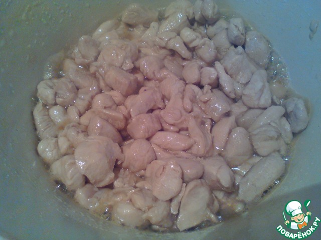 • Растительное масло раскалить. Обжарить курицу на сильном огне до готовности.