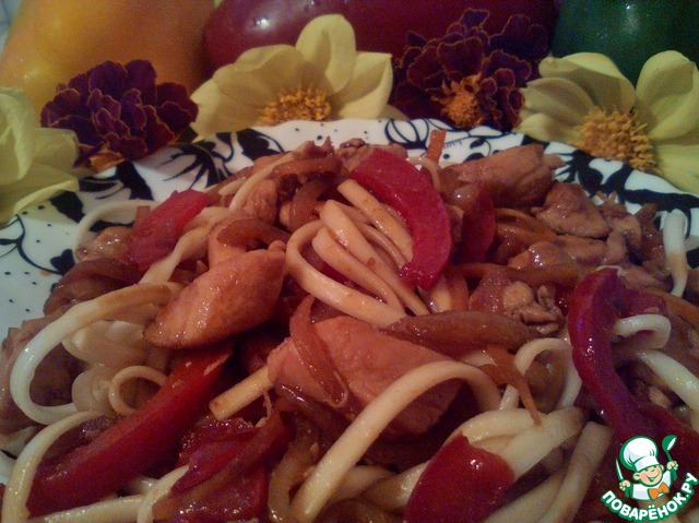 • Лапшу добавить к курице с овощами. Перемешать и прогреть пару минут.