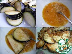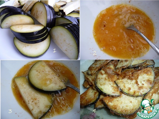 В миске взбить яйцо, соль, перец немного. Каждый кусочек баклажана окунуть в яичную смесь и обжарить на сковороде в разогретом масле. Выкладывать баклажаны на салфетку, чтобы масло стекло. Остудить. -