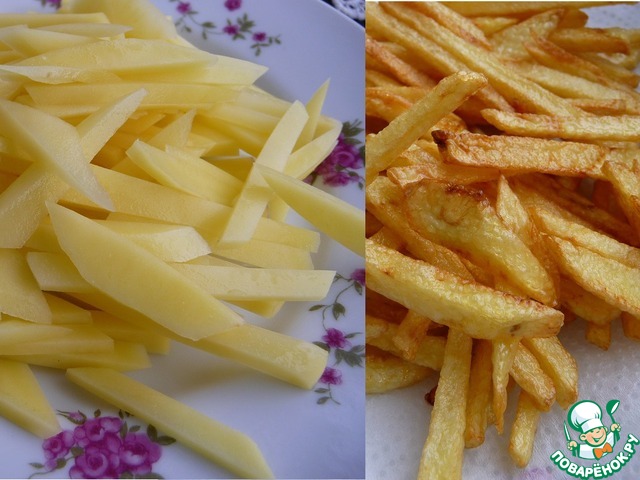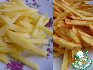 Картофель нарезать тонкой соломкой. Обжарить во фритюре до золотого цвета. Остудить.
