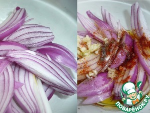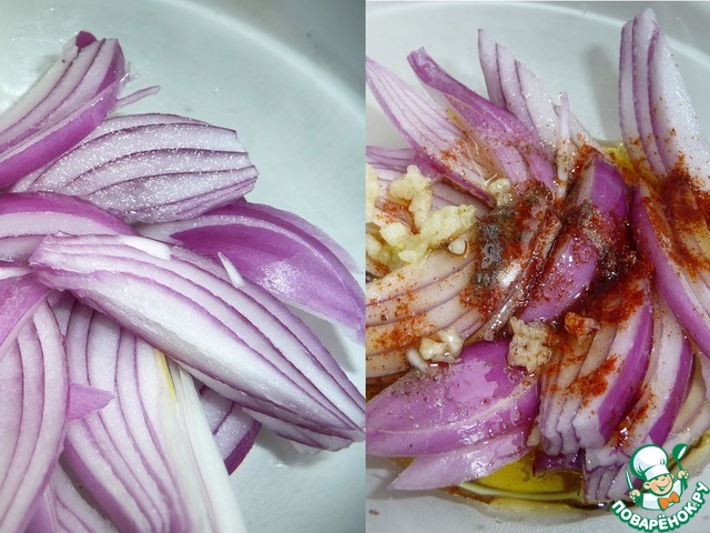 Готовим заправку для салата. Лук нарезать перьями, соль, перец, чеснок, лимонный сок, оливковое масло.