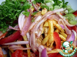 Нарезать зеленый лук, измельчить петрушку, добавить заправку.