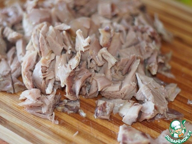 Когда курица готова, вынимаем ее и остужаем. Режем на кусочки. Взять 1 ч. л. бульона и оставить остужаться для дальнейшего использования.