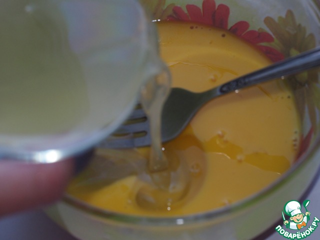 Отделяем белки от желтков. Белки смешать при помощи вилки с 1 ст. л. остывшего бульона, к желткам добавить лимонный сок.