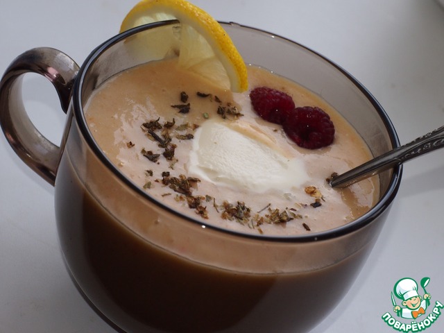 Перед подачей взбить суп блендером, наполнить супницу, добавить сметану или масло по вкусу, посыпать рубленой свежей или сухой зеленью. Украсить долькой лимона.