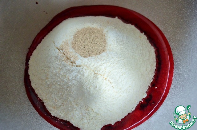 Всыпать просеянную муку, соль, сахар, дрожжи.