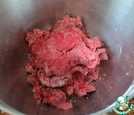 Для свекольного теста необходимо отжать сок. Именно из печеной свеклы цвет готового изделия будет ярким, в то время как из сока сырой может получиться выпечка серого цвета.