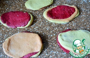 Взять каждого теста по 250 г., разделить на 5 кусочков, по 50 г..