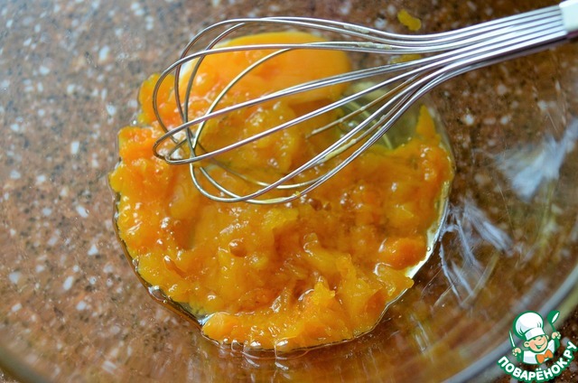 Муку смешать с разрыхлителем и, подсыпая к тыкве, замесить тесто. Оно не тугое, но и не липнет к рукам.