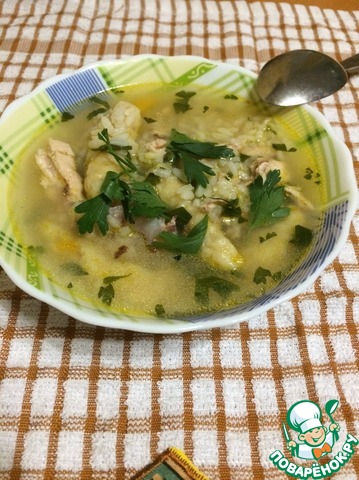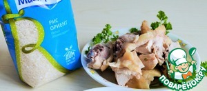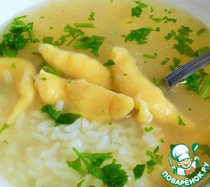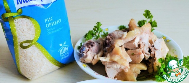 Готовую курицу вынуть, бульон процедить на сите, отмерить 1,5 л. Вновь поставить на огонь. Всыпать рис и варить 10 минут.