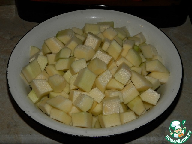 Все ингредиенты даны из расчёта на 1-литровую банку. Кабачки помыть, почистить от кожуры и семян. Нарезать кубиками.