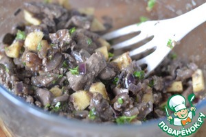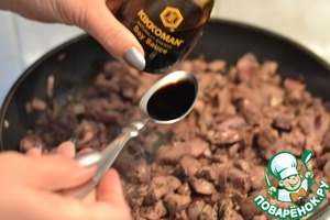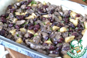 Печень помыть, очистить от пленок и нарезать на средние кусочки.