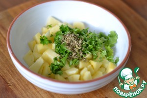 Нарезать петрушку и добавить к яблокам. Добавить орегано. -