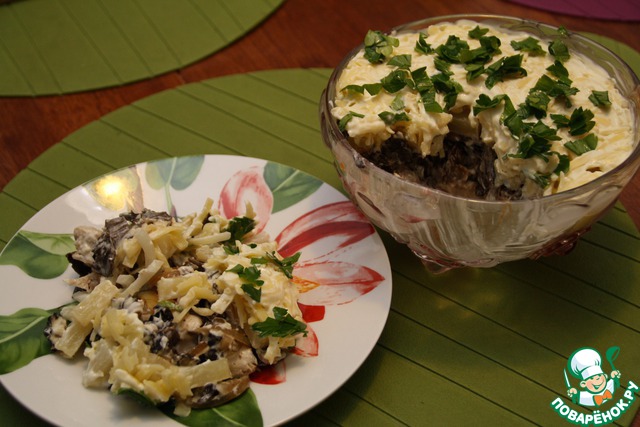 1 -й слой - шинкованный тонкими полукольцами лук, предварительно замаринованный в уксусе.