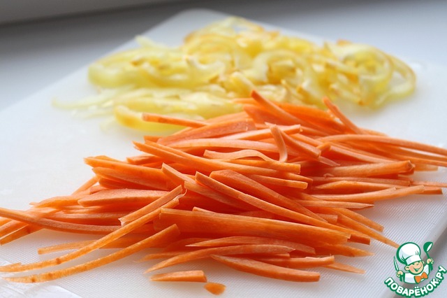 Очищенный от семян перец и морковь нарезать тонкими полосками. (Что касается моркови: я сначала использовала терку-мандолину, а потом ножом нарезала уже тонкие полоски.)