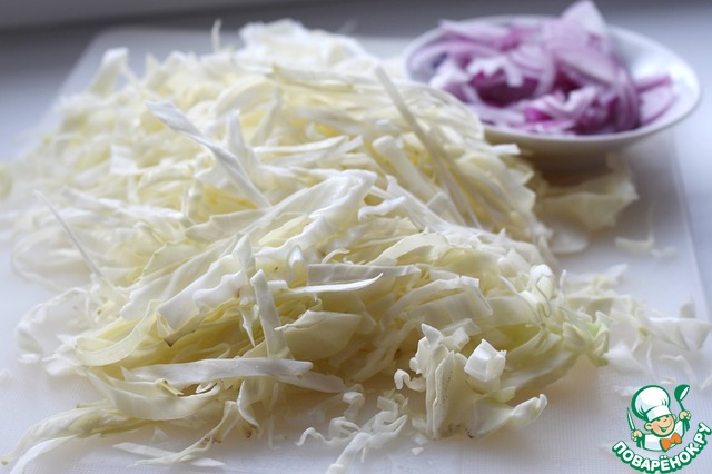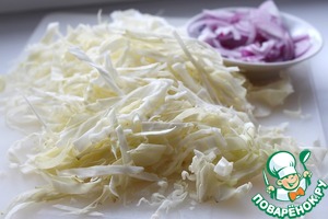 Капусту мелко нашинковать, красный лук нарезать тонкими полукольцами.