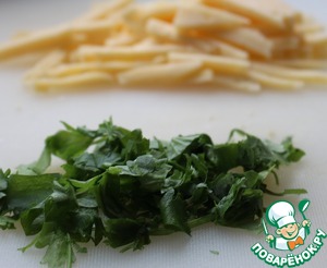 Сыр нарезать тонкими полосками. Зелень измельчить.